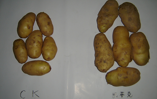 河南鄭州市滎陽高村農(nóng)民黃海望,共種6畝馬鈴薯,其中5畝用的眾德套餐,眾德生物有機肥80公斤,15-10-20高鉀型眾德牌摻混肥100斤在翻地前施用,100斤15-10-20高鉀型眾德牌摻混肥種肥同播,出苗后用態(tài)康科250倍液噴施兩次,另外一畝做對照,同等有機肥,100公斤15-15-15含量的復(fù)合肥作底肥。施用眾德牌摻混肥的馬鈴薯莖葉不旺長,發(fā)根早、根粗、苗壯,中期苗高比對照高15-20厘米,長勢好、病害少,收獲時馬鈴薯個頭大、品質(zhì)好、表面光滑,上市早,賣價高,產(chǎn)量比對照高58-60%,畝產(chǎn)達到6100多斤。